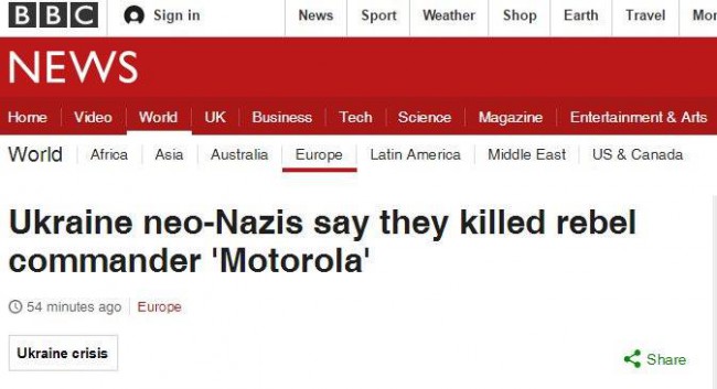 Надо отдать должное — чуткие цензоры самых свободных СМИ моментально уловили злобное нарушение и как только читатели начали перепечатывать новость и интересоваться: «Так что на Украине и правда неонацисты?», так сразу сменили заголовок на идейно правильный: «Моторола»: украинские повстанцы обвиняют Украину в смерти командира», а комментарии подтерли. К их сожалению, старый заголовок был несколько часов доступен в поисковой выдаче Google.