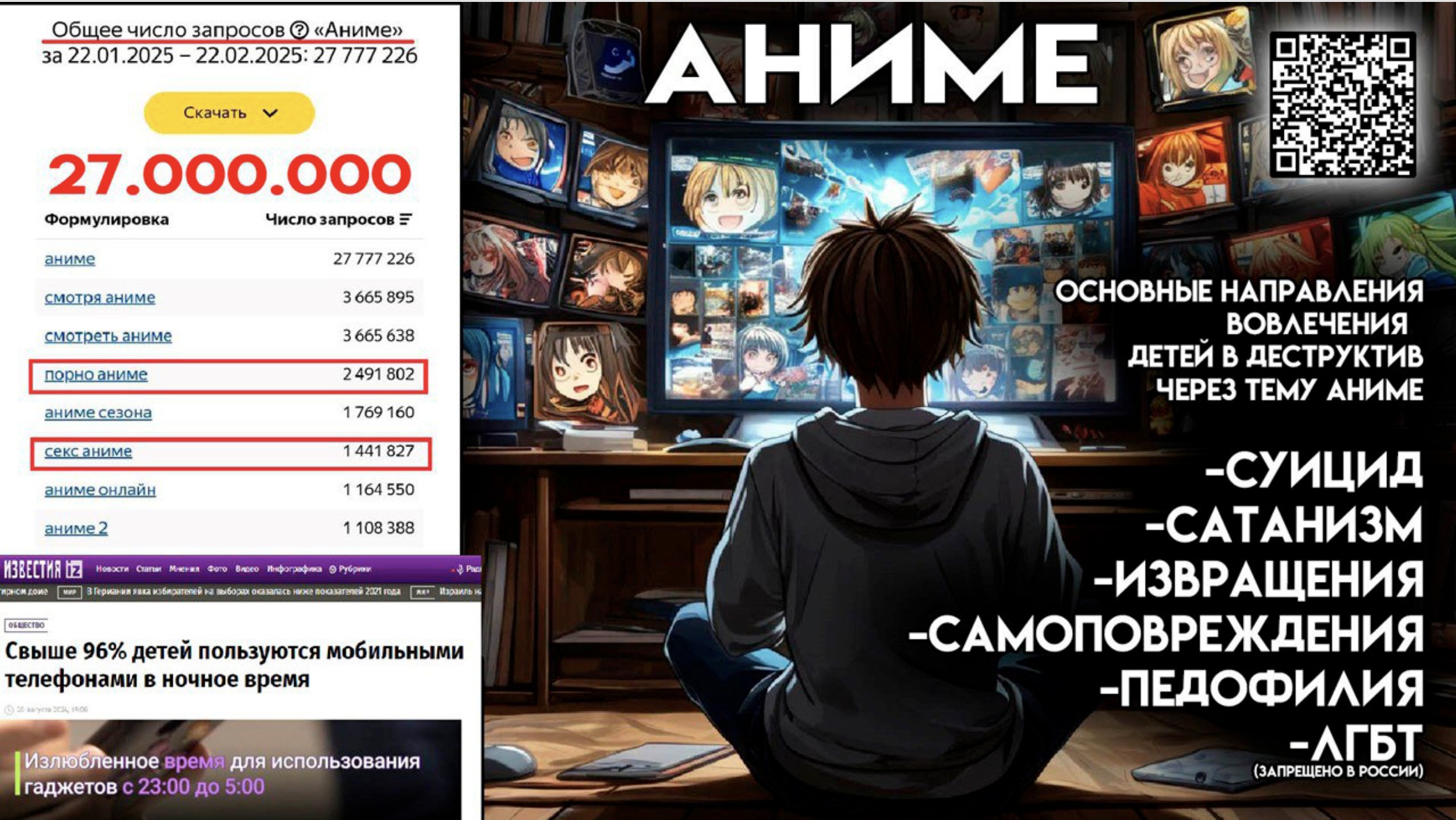 Роскомнадзор проводит большую работу, блокирует десятки тысяч страниц с «запрещенкой» - но меньше ее не становится, т.к. на месте заблокированных появляются новые группы и сообщества, которые зачастую генерируются с помощью ИИ, и число которых измеряется шестизначными цифрами. Одна из главных воронок вовлечения детей в содомию, а равно в сатанизм, самоповреждения, педофилию и суициды- это аниме.