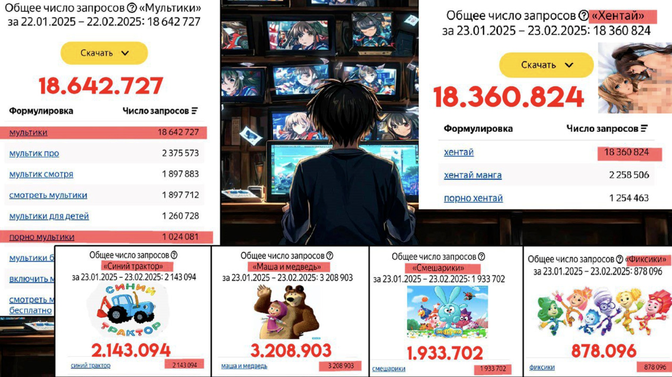 В 2024 году, после признания ЛГБТ запрещенной в России экстремистской организацией, Роскомнадзор пытался блокировать ряд таких сообществ - но вот свежая статистика: 18 млн запросов за сутки по запросу "анимэ хентай", из которых 1,2 млн - "порно хэнтай". Для сравнения: «Смешарики» -1,9 млн, «Фиксики» - 800 тыс, «Маша и Медведь» - чуть больше 3 млн