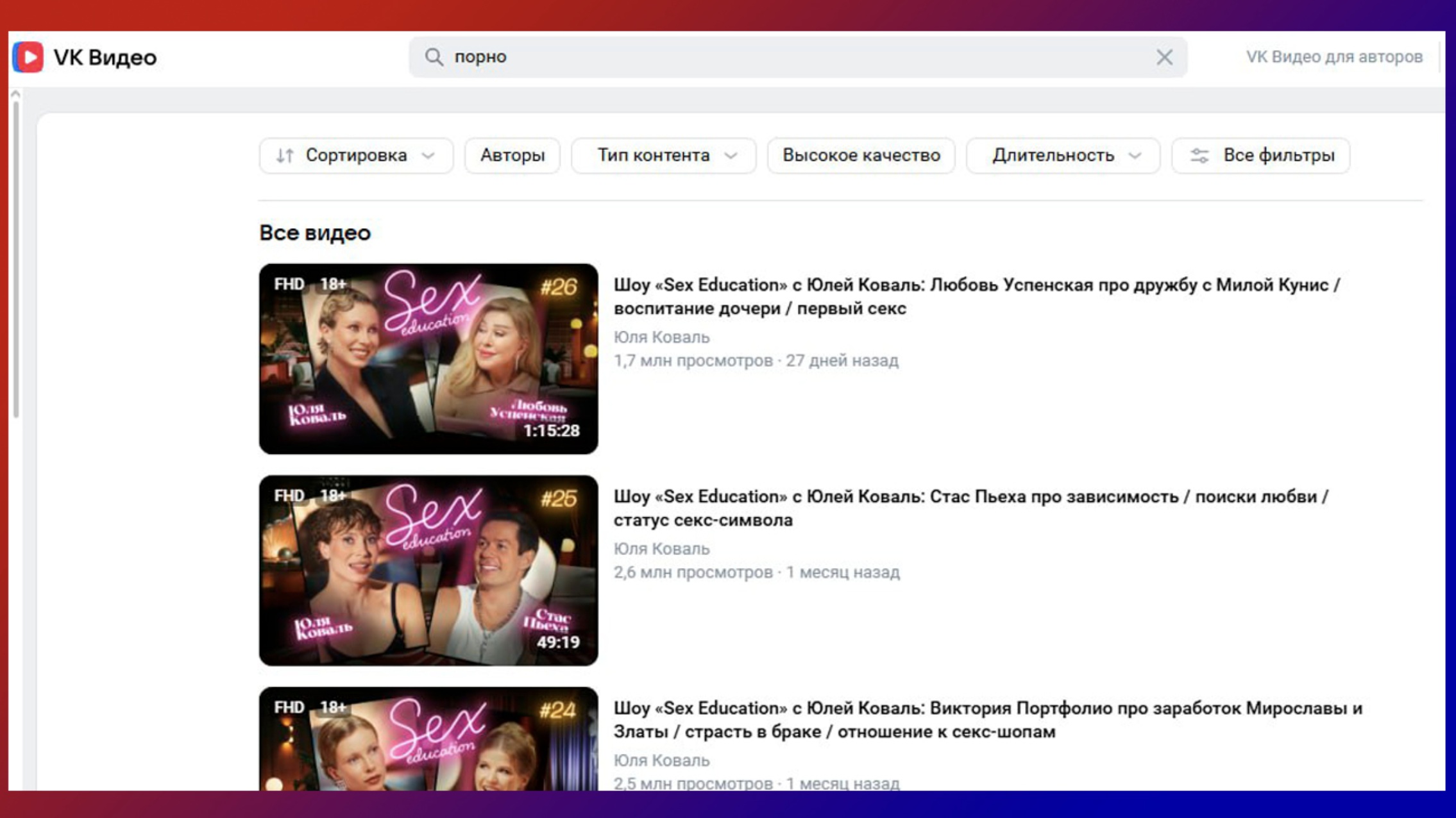 Так, например, ВК удалил откровенную порнографию и прочую чернуху из поисковой выдачи в своей сети,