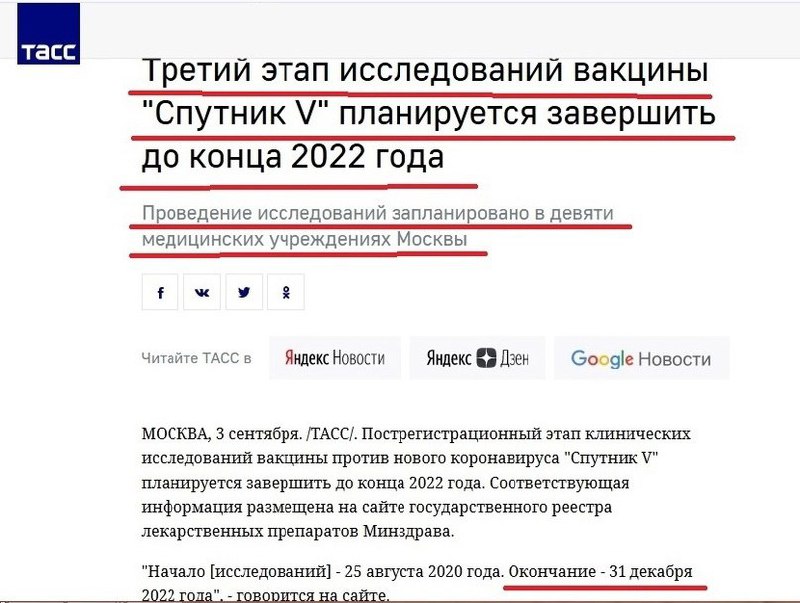 В сентябре же 2020 г. началось исследование фазы 3 (это был именно полноценный 3 этап испытаний, который был объединен с 4-м и должен был завершиться в декабре 2022 г. - см. скрин из новости ТАСС). В отличие от других ведущих производителей вакцин, протокол «Спутника V» так и не был опубликован. Между тем, это ключевой документ КИ: в нем описывается схема эксперимента, заранее указывается, какой результат и по какому критерию исследователи считают успешным, сколько для этой цели нужно добровольцев и прочие подробности. Заявленное исследование на 40 тыс. человек у нас до сих пор под грифом «секретно».