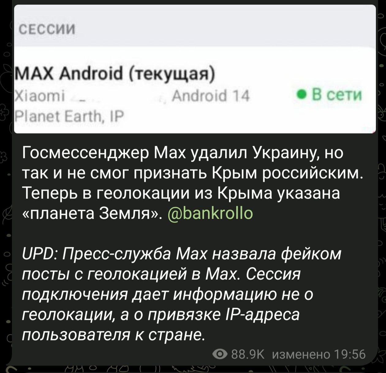 Увы, но чего ещё можно было ожидать, если ранее в своих рекламных постах Max забывал указать на карте России вернувшиеся в страну регионы, да и вообще локацию ДНР он определяет, по американскому сервису, как "Донецка область"? Т.е. так, как это делает враг.