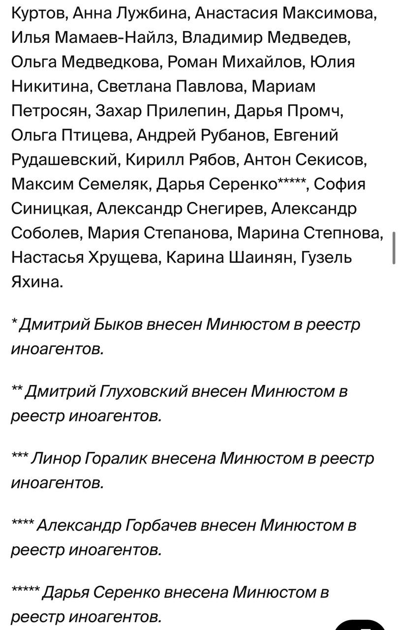 Для понимания – список составлен из тех, кто высказывал свое фи к России и ее народу и тех, кто ненавидит Россию и спонсировал убийства русских, перечисляя деньги на ВСУ. Наталия Осс, https://t.me/ossinoe/19408 которая назвала кочующую группу этих экспертов и писателей "сектой", не права. Это не секта, а именно то, о чем и писала Кучерская – "сопротивление" или террористическая группа, деятельность которой направлена на дестабилизацию ситуации в России, просто вместо бомб и дронов они используют книги и рассказы. Цель у них одна.