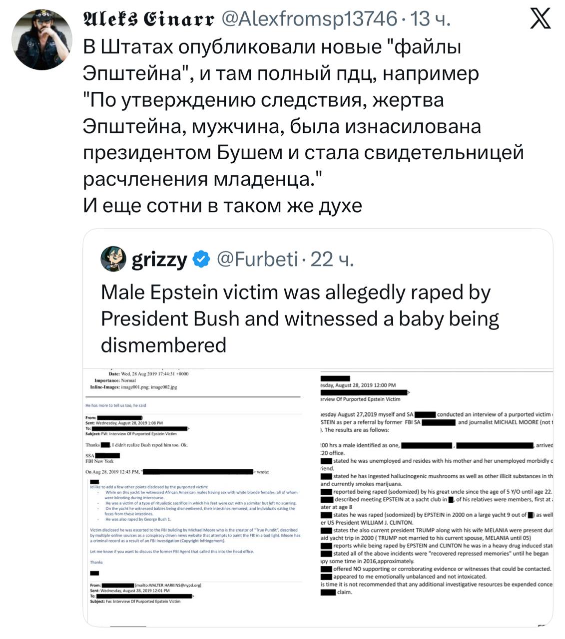 И раз уж в файлах Эпштейна неоднократно упоминается участие в преступных действиях педофилов несовершеннолетних из России, сутенеров ("модельных агентств") из России, посредников из России, которые "управляли репутацией", т.е фактически пиарили самого Эпштейна - наверно, этим должен заинтересоваться Следственный комитет РФ, ФСБ и другие ответственные структуры? И не просто заинтересоваться - а начать искать ниточки и заводить дела.