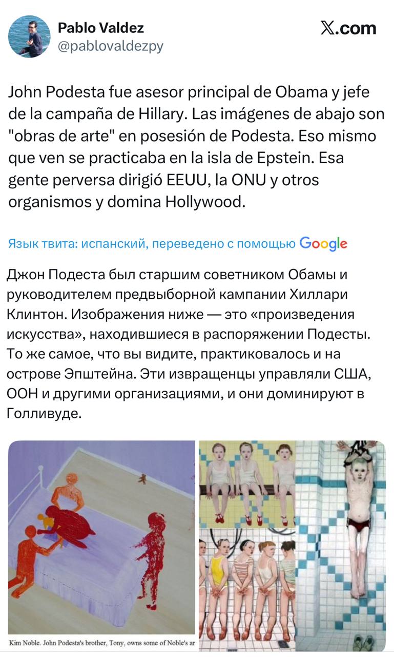 P.S. И еще важное замечание - история с Эпштейном стала тем окном в мир реально правящей миром теневой элиты, о которой постоянно говорили думающие люди. Которых СМИ и "просветители" всегда костерили как конспирологов, мракобесов и проч. На острове Эпштейна регулярно бывал и Джон Подеста, руководивший избирательной кампанией Хиллари Клинтон в 2016 г. Тот самый главный фигурант педофильского скандала "Пиццагейт", вскрытого Ассанжем. Там же и сербская оккультистка Марина Абрамович со своими "духовными завтраками" (каннибилизмом) по Алистеру Кроули, там же леди Гага и проч. В 2009 г. мексиканская модель Габриэла Хименес на частной вечеринке в отеле в Монтеррее начала кричать, что околоэпштейновская "элита" ест детей. Вскоре она пропала без вести.